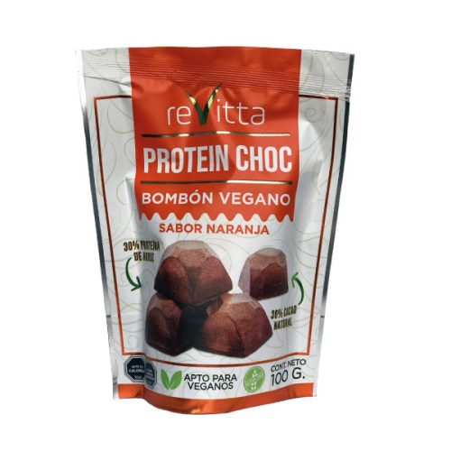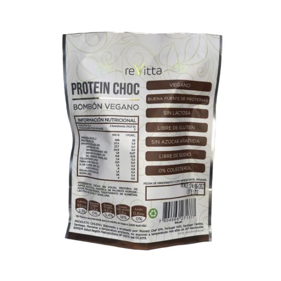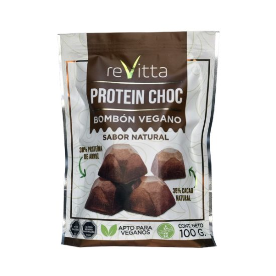 Protein Choc 100 grs. de Revitta Wellness son bombones de chocolate vegano con un aporte de proteínas. Bombon vegano es elaborado a partir de Proteína Vegetal (Proteína de arroz al 30%) y Cacao Natural (36 %), lo cual lo convierte  en un alimento saludable y sabroso.