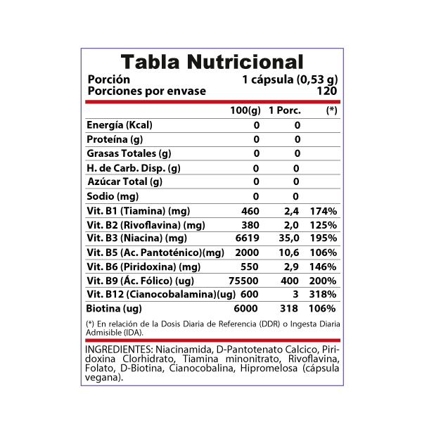 El complejo B vitta-B complex, incluye las conocidas vitaminas hidrosolubles aparte de la vitamina C. Con su principal función de cofactores enzimáticos indispensables en el cuerpo, frente al metabolismo de carbohidratos, lípidos, aminoácidos. Además, de prevención de patologías neurológicas, respiratorias, anemias, problemas de alopecia, dermatitis e inflamación.