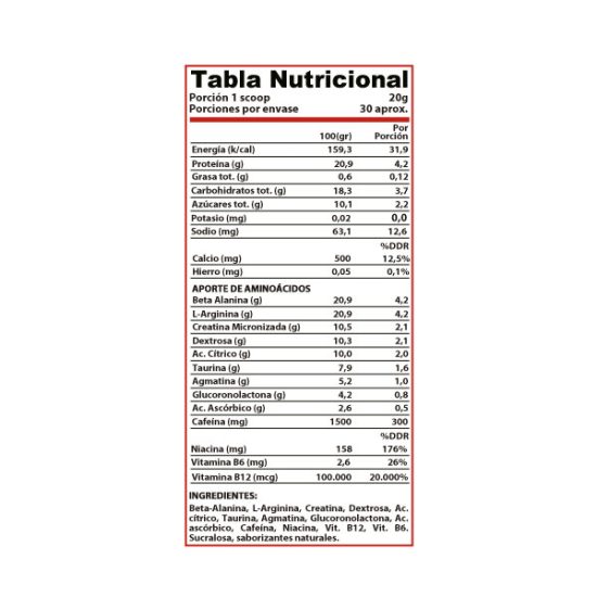 • Con adición de aminoácidos, cafeína, creatina y beta alanina.
