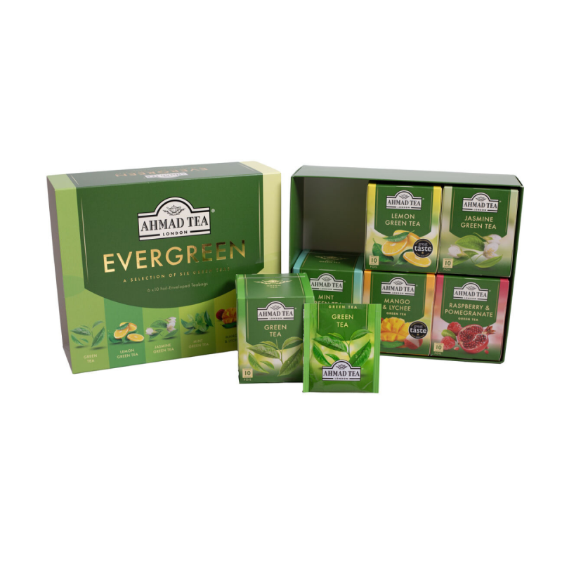 Descubre nuestra Evergreen Collection, una selección premium de los tés verdes más populares. Cada caja incluye 60 bolsitas con envoltura individual (10 de cada variedad): Green Tea Pure, Jasmine Romance, Mint Mystique, Lemon Vitality, Mango & Lychee y Raspberry & Pomegranate. Una experiencia completa del té verde, desde sabores clásicos hasta combinaciones frutales y florales, elaborada con hojas de té chino de alta calidad para los verdaderos amantes del té verde.