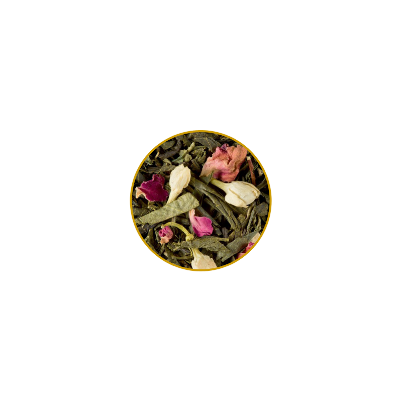 Un sutil equilibrio de notas frescas, frutales y florales se encuentra en este té verde delicadamente perfumado que es igual de delicioso ya sea que lo disfrutes frío o caliente. Blend de té verde jazmín, aromas de lychee, pomelo, durazno y rosa