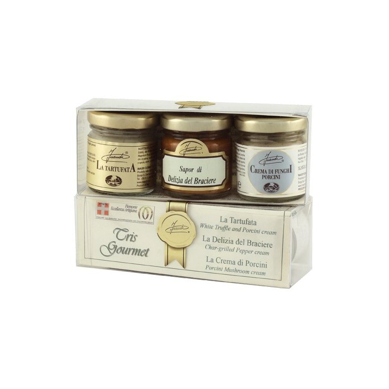 Este trio contiene tres cremas de producción Inaudi: LA TARTUFATA®, Sapor di Delizia del Braciere, crema de setas porcini.